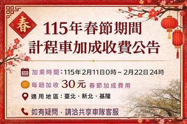 親愛的乘客您好: 感謝您長期以來對本車隊的支持與信賴!為配合地方政府公告並保障駕駛於春節期間的服務品質與勞動權益,本車隊將於農曆春節期間實施計程車運費加成措施,詳情如下: